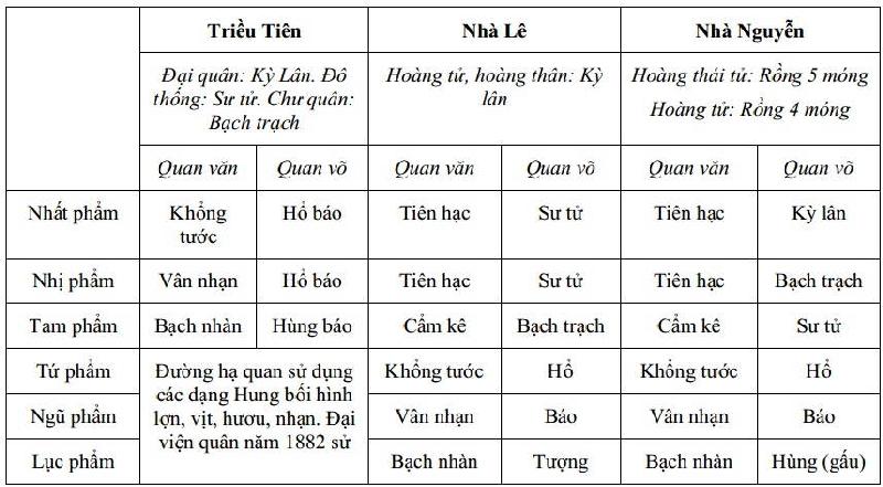 "Các vị hoàng thân và các quan văn võ từ tam phẩm trở lên, mũ Triều phục dùng mũ Phốc Đầu, hoàng thân trang sức vàng, văn võ trang sức bạc, phục sắc màu tía. Bổ tử thì hoàng thân và các vương công dùng Kỳ Lân, quan văn nhất, nhị phẩm dùng tiên hạc, quan võ dùng sư tử, quan văn tam phẩm dùng Cẩm Kê, quan võ Tam phẩm dùng Bạch Trạch. Đai thì dùng đai sừng tê, hoàng thân sức vàng văn võ nhất, nhị phẩm sức bạc, tam phẩm sức đồi mồi bọc là đỏ. Tứ phẩm tới ngũ phẩm, quan võ dùng nón bạc, quan văn dùng Phốc Đầu không trang sức, phục sắc màu lục, Bổ tử thì quan văn võ tứ phẩm dùng Hổ, quan văn dùng Khổng tước, quan võ ngũ phẩm dùng Báo, quan văn dùng Vân nhạn. Đai thì quan văn võ đều dùng đai đồi mồi sức thau bọc là đỏ. Từ lục phẩm trở xuống, quan võ đội nón sơn, quan văn đội Phốc đầu không trang sức, phục sắc màu xanh. Bổ tử thì quan võ dùng Tượng, quan văn dùng bạch nhàn. Đai thì quan văn võ đều dùng đai tốc hương viền thau bọc đoạn thâm"