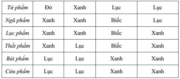Màu sắc cùng các quy chế nêu ở bảng dưới